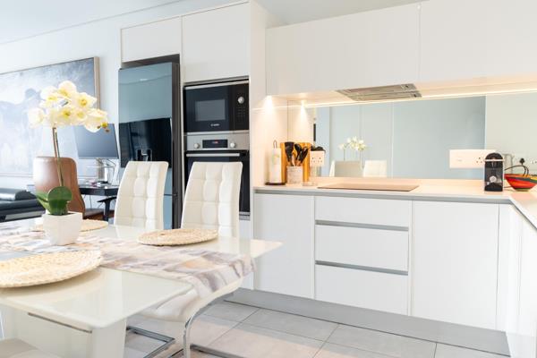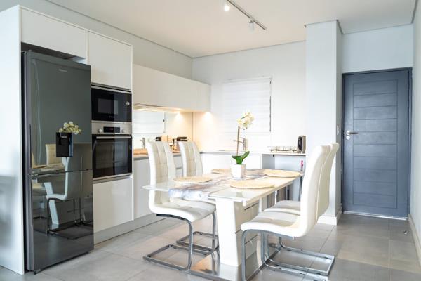 A well-proportioned open-plan living and dining area flows to a covered balcony fitted with a built-in gas braai an inviting space for effortless entertaining or unwinding at sunset. The kitchen features clean, contemporary finishes and a practical layout designed for everyday convenience.
