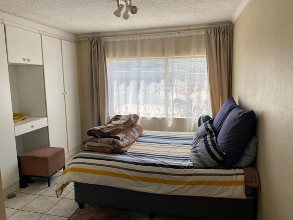 The home features 3 well-sized bedrooms with built-in cupboards and 2 bathrooms, including a main en-suite. An open-plan kitchen and living area.