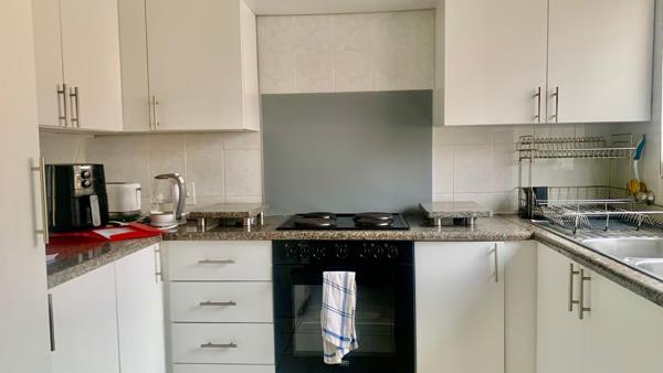 The unit spans 96m² and features an inviting entrance hall that leads into an open-plan living area, where the tiled flooring adds both elegance and durability. The spacious lounge is ideal for both relaxation and entertainment, offering plenty of room for family gatherings or quiet evenings at home. The adjoining kitchen is compact yet highly functional, showcasing sleek white cabinetry, granite-look countertops, and built-in appliances, including a hob, oven, and double sink. The kitchen is designed to accommodate modern living, with a dedicated space for a washing machine, ensuring ease of use for both cooking and laundry tasks. A convenient pass-through window opens the kitchen to the living area, enhancing the flow of the space.