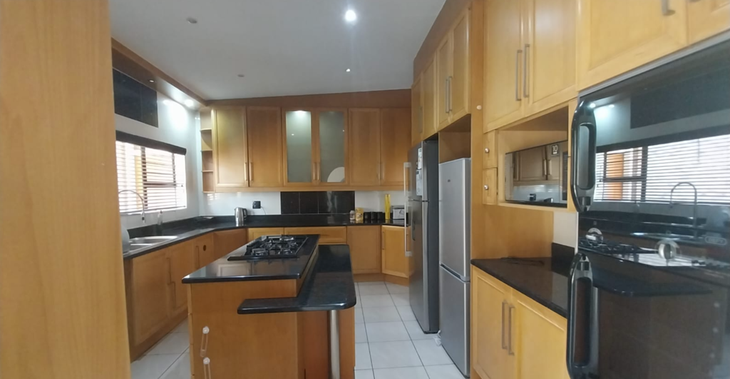 This home offers four spacious bedrooms with built-in wardrobes, tiled flooring and two full luxurious bathrooms of which one is on-suite to the main bedroom and a guest toilet. The stylish kitchen which is the heart of this home and comes with a gas stove, granite countertops and a scullery with a washing machine and dishwasher connection. An open plan dining room and lounge area that leads into an enclosed entertainment area with