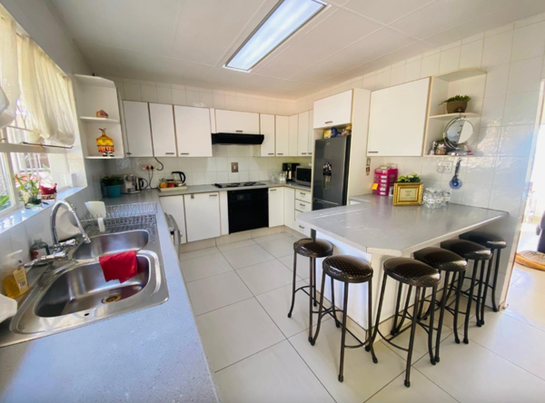 Outside you will enjoy the enclosed patio both morning and night which looks out onto the well maintained garden and swimming pool with a built-in braai area. There is staff accommodation, two garages and good security.