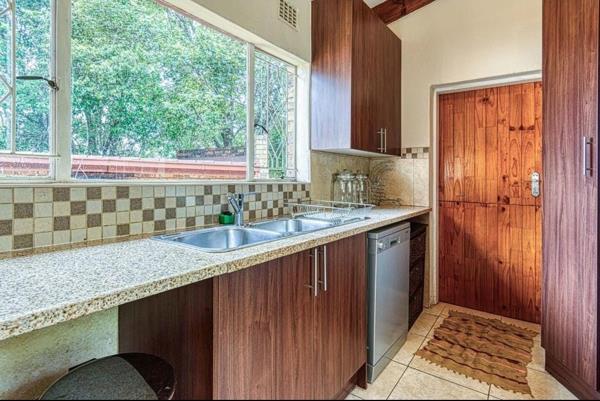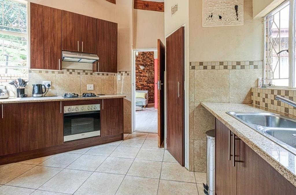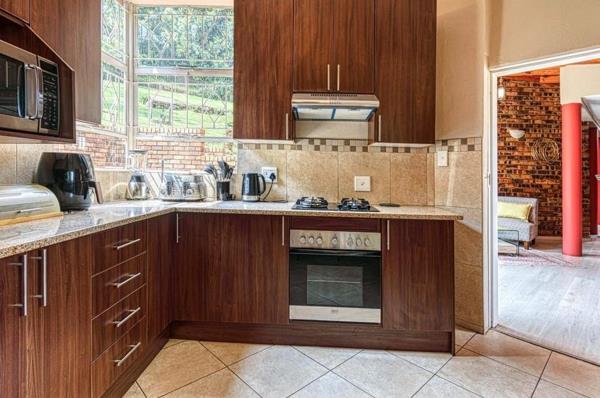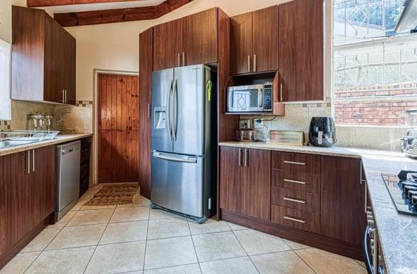 Step inside to discover four spacious bedrooms each with built-in wardrobes and tiled flooring. The main bedroom features a luxurious onsuite bathroom creating a private retreat. The heart of the home is the large kitchen equipped with both electric and gas stoves, granite countertops and ample counter space for meal preparation. A separate scullery adds to the functionality. The open plan dining and lounge areas provide a seamless flow for entertaining with an additional lounge offering extra living space.