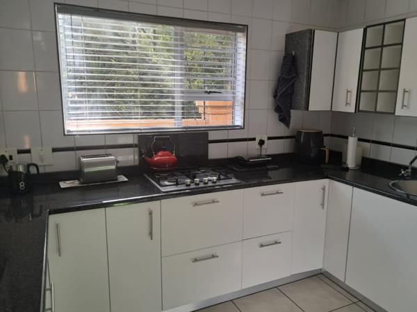 Step inside to discover a spacious and well-lit interior, featuring clean, light-colored tiled flooring throughout. The expansive living area offers a neutral canvas for personal styling, flowing seamlessly into a dedicated dining space, complete with a modern granite-top table. The functional L-shaped kitchen is a highlight, boasting dark granite countertops, contemporary white cabinetry, a double stainless steel sink, and a built-in gas hob. A convenient pantry ensures ample storage.