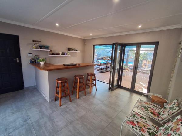 The open-plan living area - from entertainer''s lounge, bar area and dining room. The bar area leads out through stacker sliding doors - to a covered patio overlooking the garden and sparkling pool - great design for those entertaining days. There is also a separate formal lounge.