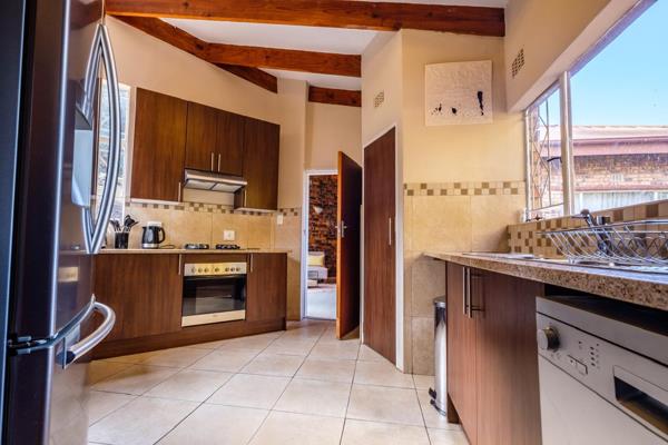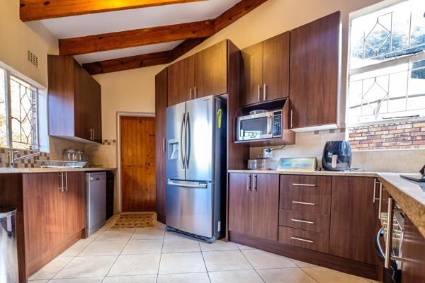 This property features four well-sized bedrooms and three bathrooms, including a main en-suite. Multiple living areas provide space for the whole family, with a separate lounge, TV room, and a formal dining room. The kitchen is fitted with granite countertops and a gas stove, perfect for cooking enthusiasts.