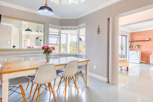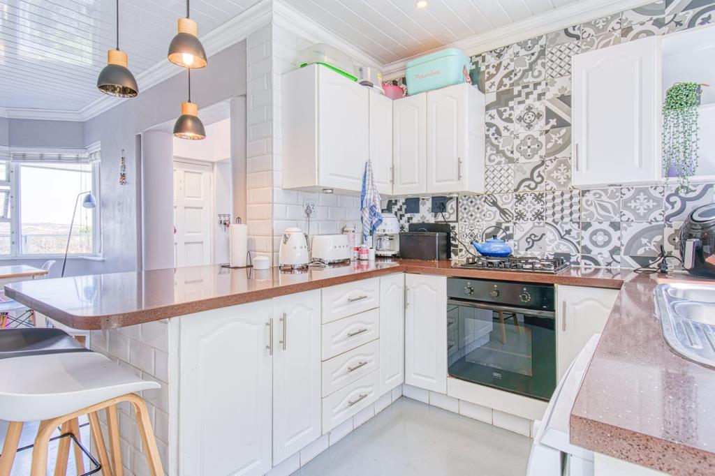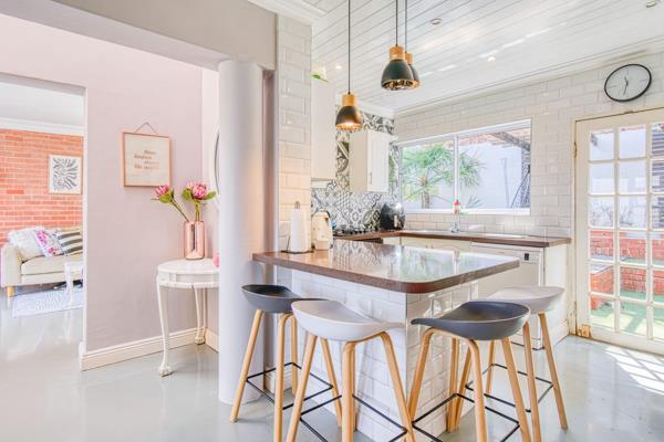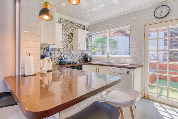 Step inside to an inviting open-plan layout, where natural light floods the living and dining areas through large bay windows and glass doors. The contemporary kitchen is a highlight, featuring sleek white cabinetry, a stylish patterned tile backsplash, and integrated appliances including an oven and gas hob. A functional breakfast bar with pendant lighting creates a perfect spot for casual meals and social interaction, seamlessly connecting to the main living space. An exposed brick accent wall adds character and warmth to the communal areas.