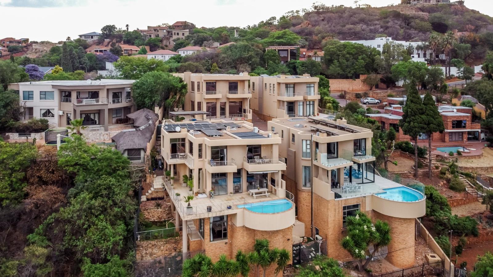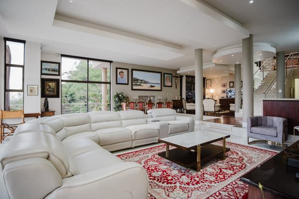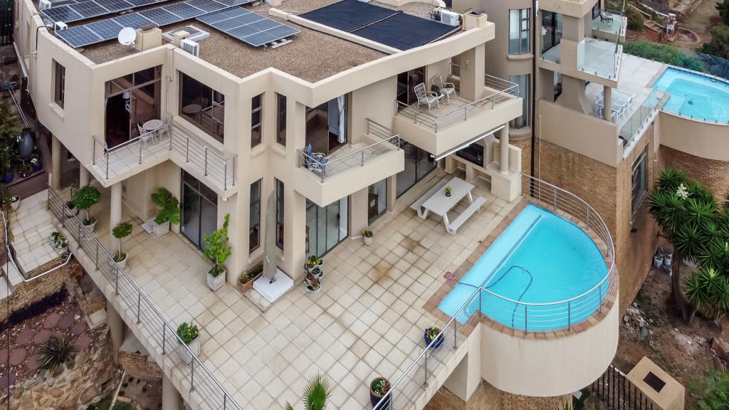 The main living area is fully tiled and open plan, boasting two spacious lounges that flow seamlessly onto a large entertainers balcony complete with a fitted braai, sparkling pool and panoramic views. Then dining area compliments the flow and a modern, well-appointed kitchen with a separate scullery is enticing for entertaining.