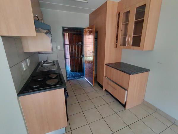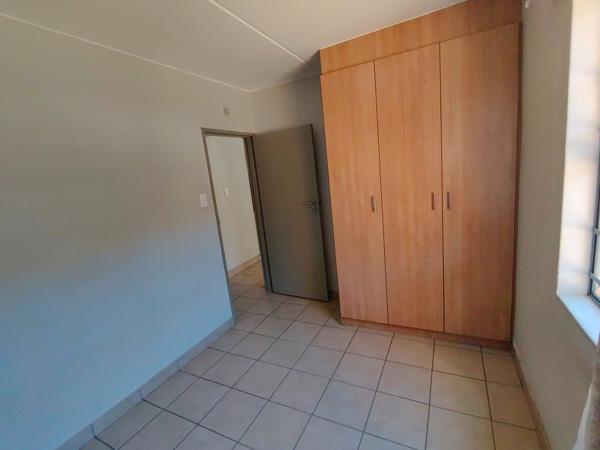This spacious first-floor apartment offers an open-plan kitchen and lounge leading onto a private patio, perfect for relaxing or entertaining. The two well-appointed bedrooms feature built-in cupboards, and the full bathroom includes a bathtub, basin, and toilet.