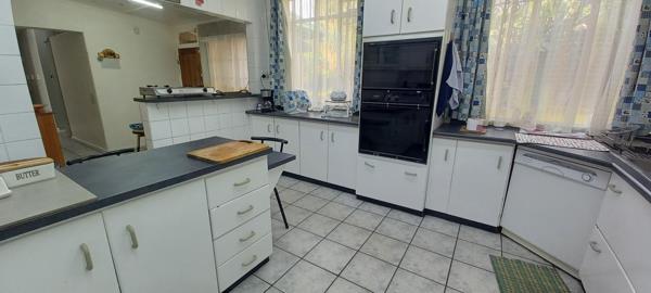 The interior features an inviting open-plan lounge and dining area, providing ample room for relaxation and entertaining. Tiled flooring throughout ensures practicality and easy maintenance. The home includes two functional kitchens, with the main kitchen offering white cabinetry, an island, and a double oven, complemented by a second utility kitchen. A dedicated bar area adds to the entertainment possibilities.