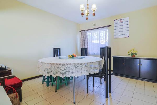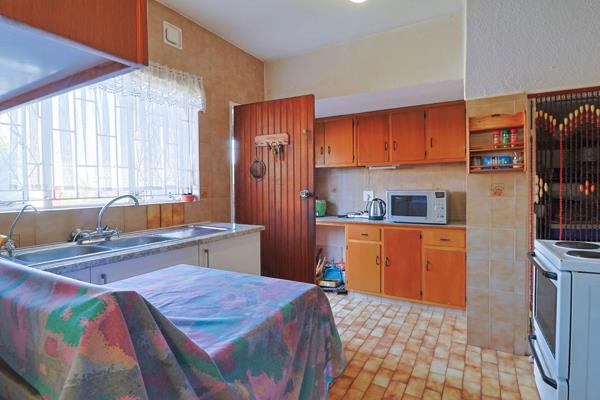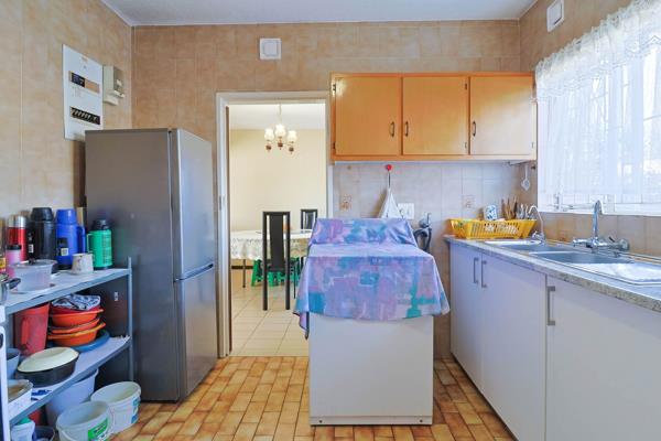 The spacious tiled dining area leads off the archway portal to the practical, easy to manage around square shaped kitchen with freestanding Defy hob-stove and oven, spaces for wide refrigerator and a front-loader washing machine with ample built-in cupboard spaces all round. A double sink set in a new granite topped cupboard completes the scullery.