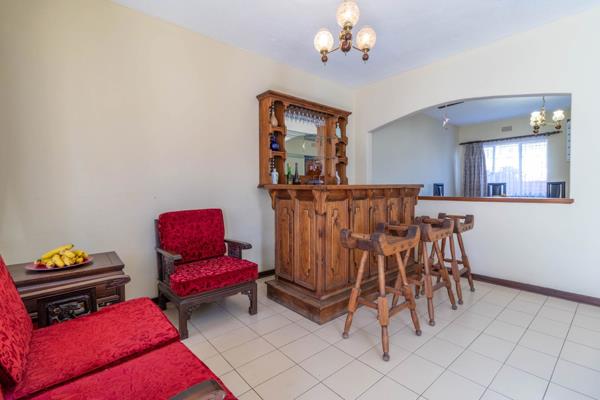 One enters passing a neat gated shrub-lined garden with a well maintained small lawn along a paved pathway to the entrance door leading directly into the fully tiled open plan 2 part living room. The sunny North-facing room boasts a bar with counter, and it is contiguous with the open plan lounge, with good space for a comfortable lounge suite and a coffee table.