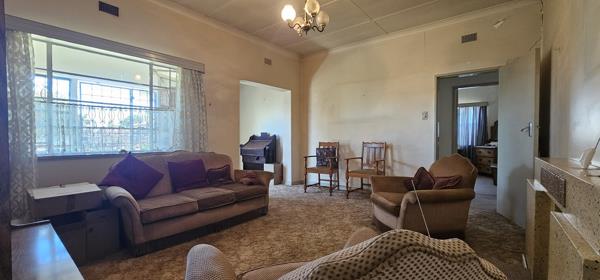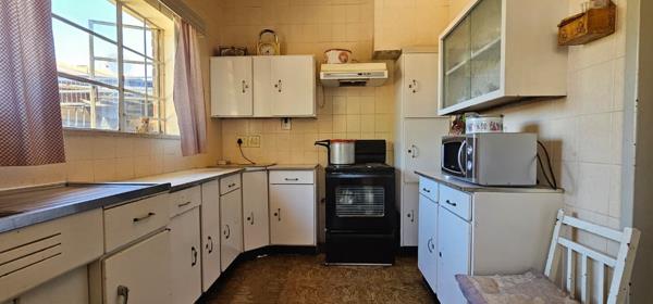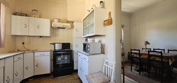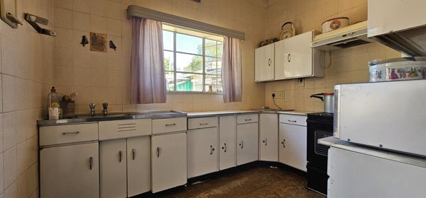 The interior boasts a spacious lounge, filled with natural light and featuring a traditional fireplace, awaiting a modern transformation. An enclosed porch or sunroom provides a versatile additional living space, brightened by large windows and secured with decorative burglar bars. The functional kitchen, though dated, offers ample counter space, storage, and natural light, ready for a contemporary upgrade.