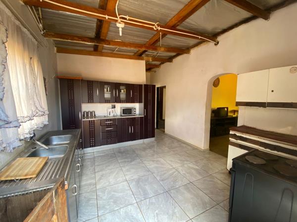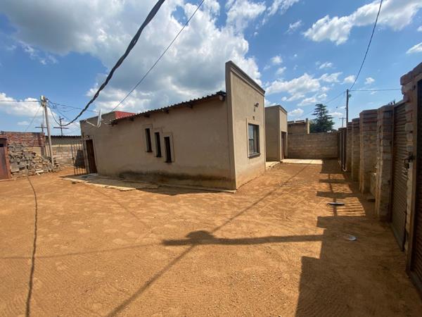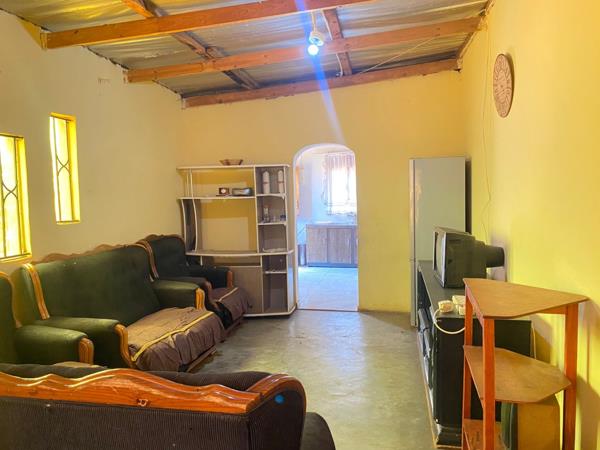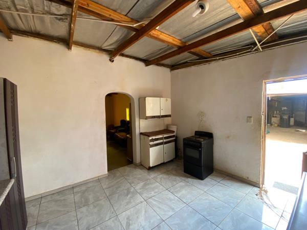 This property offers two bedrooms, open plan dining and lounge, kitchen. Bathroom needs completion. Includes one outside room, an outside toilet, and a single door garage. The yard is walled and gated.