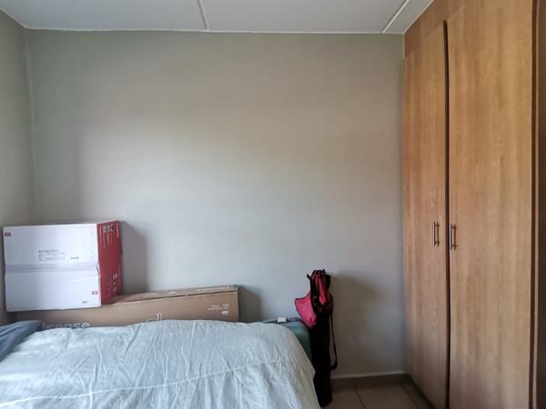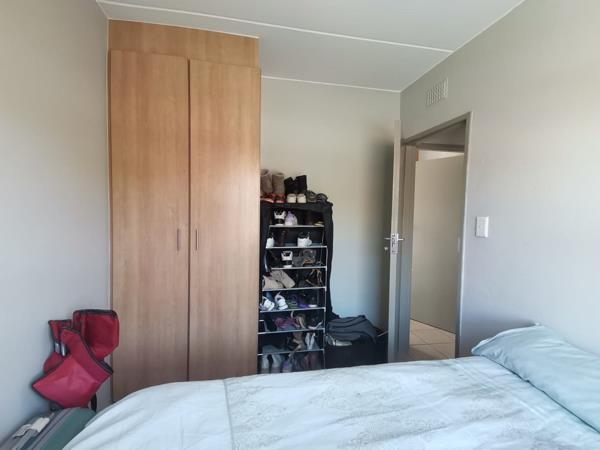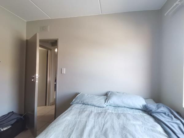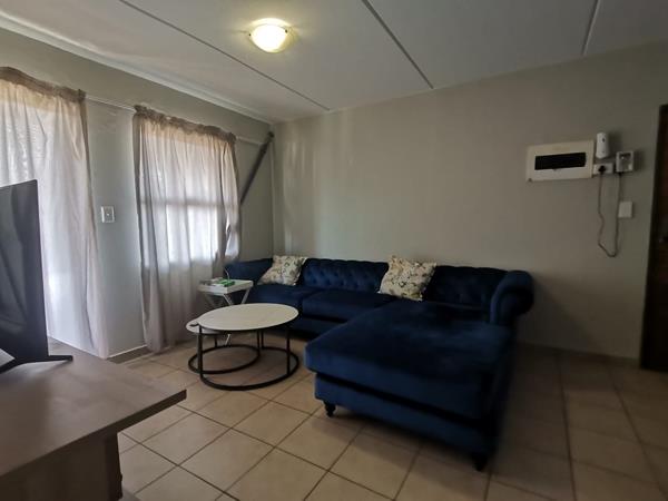 This well-managed and 24-hour surveillance complex offers a first-floor unit with a charming open-plan lounge and kitchen, complete with ample built-in cupboards and a fitted stove with oven, leading to the balcony with views.