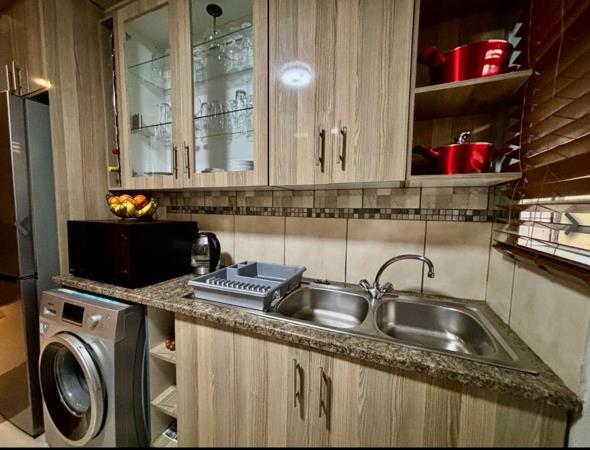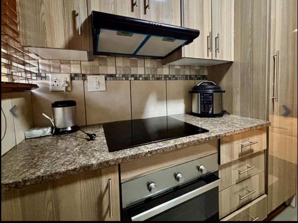 As you enter you are greeted by a spacious and airy lounge tailored with downlights and porcelain tiles that seamlessly flows into the modern kitchen. The kitchen is a chefs dream with granite countertops, compartments for a washing machine or dishwasher, a four-plate glass-top stove with an extractor fan, an under-counter oven and a dedicated space for a fridge. The three spacious bedrooms are fitted with built-in wardrobes and ample natural light. The master bedroom boasts additional wardrobe space and an onsuite bathroom with a shower, basin, toilet and bath. The second bathroom mirrors this luxury ensuring comfort for all.
