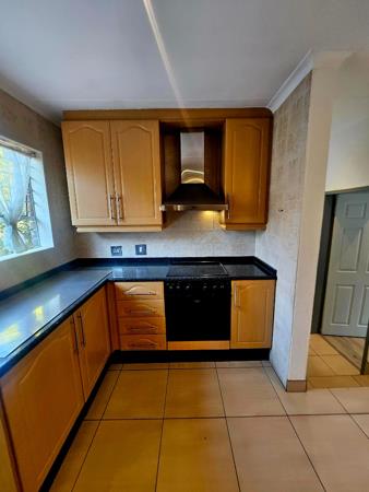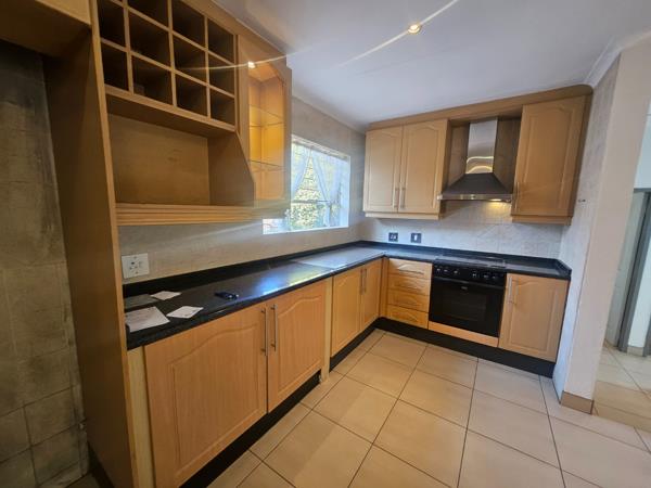 Inside you will find three cozy bedrooms fitted with modern Melanie cupboards and warm wood themed tiles that create a welcoming atmosphere. The main bedroom includes an onsuite bathroom while the second bathroom is equally elegant with modern finishes and tiled walls. The kitchen is thoughtfully designed with an electric stove, hob and generous cabinet space flowing seamlessly into the open plan dining room and lounge areas.