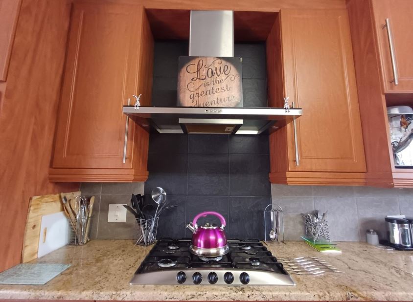 Large family kitchen with plenty of cupboard space, gas hob, and room for all your appliances.