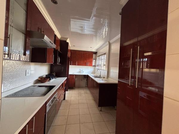 Upon entering, you are welcomed by an inviting open-plan layout that effortlessly connects the lounge, dining room, and kitchen. Large windows allow natural light to flow throughout, creating a warm and airy atmosphere. The kitchen is a true standout fitted with sleek countertops, ample cupboard space, and modern finishes, making it a pleasure to cook and entertain in.