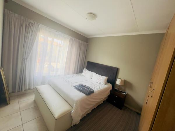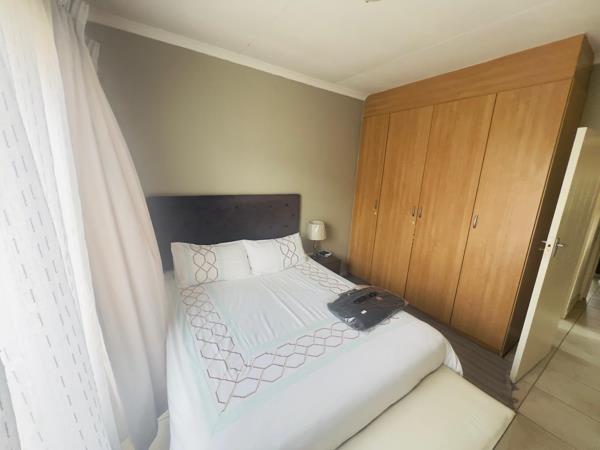 The bedrooms are thoughtfully designed with built-in cupboards, tiles, curtain rails, providing ample storage space and accommodating queen-sized beds effortlessly. The open-plan lounge radiates spaciousness and versatility, seamlessly flowing into the kitchen and the balcony, ideal for relaxation and entertainment. The kitchen boasts built-in cupboards, an electric stove, under-counter oven, washing machine connector facilitating effortless meal preparation and culinary creativity. The full bathroom is featuring a bath, basin, toilet, and shower, offering a sanctuary for relaxation and rejuvenation.