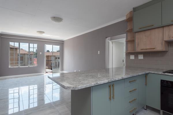 Discover this contemporary 2-bedroom, 1-bathroom apartment located in a secure complex in Meredale, Johannesburg. The heart of this home is its newly renovated, open-plan kitchen, boasting stylish two-tone cabinetry in sage green and light wood, complemented by elegant gold hardware. Granite-look countertops and a sleek subway tile backsplash enhance the modern aesthetic, featuring an integrated cooktop and double sink. This space flows seamlessly into the dining and lounge areas, all adorned with gleaming light-colored tiled flooring and ample natural light, creating an inviting atmosphere for both relaxation and entertaining.
