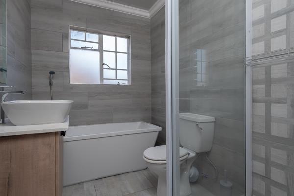 The apartment offers two comfortable bedrooms, each featuring neutral grey walls and modern tiled flooring, providing a clean canvas for personalisation. Built-in wooden wardrobes in the bedrooms offer practical storage solutions. The single, well-appointed bathroom presents a modern design with cohesive grey wood-look tiles on both walls and floor. It includes a contemporary vanity with a vessel sink, a full bathtub with a handheld shower, and a separate glass-enclosed shower, ensuring both functionality and style.