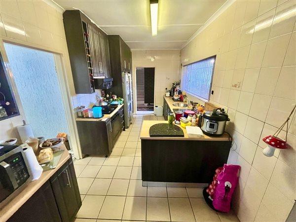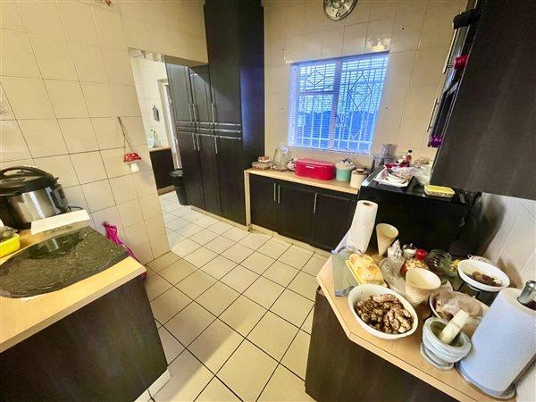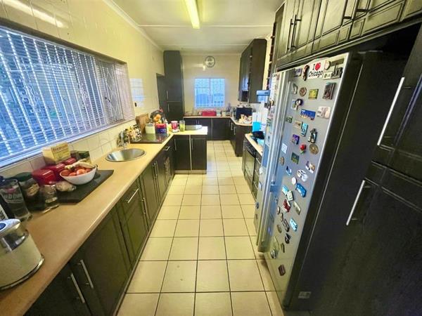 The kitchen and living areas open onto a welcoming patio that overlooks the sparkling pool, beautifully complemented by a garden and a built-in braai, making this home ideal for entertaining family and friends. With staff quarters included, there is space and practicality for every need.