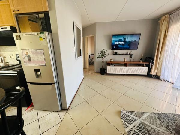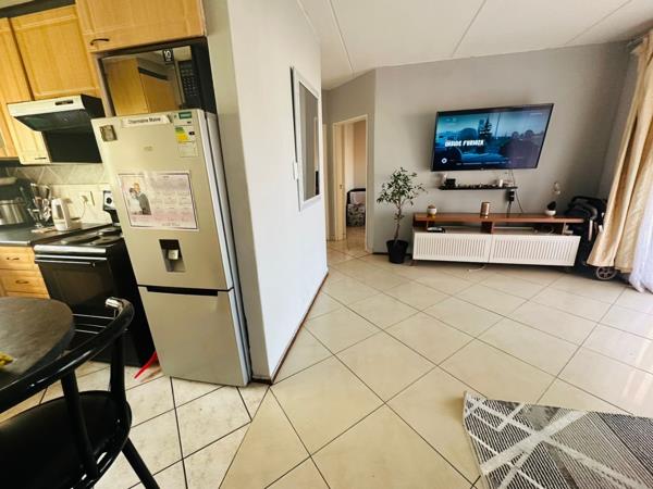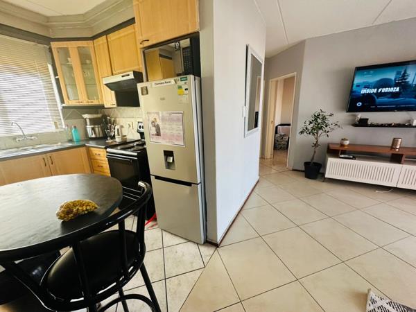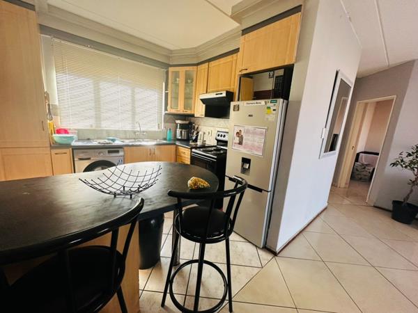 Discover comfortable living in this inviting 69 sqm apartment perfectly situated within a secure complex in Mondeor, Johannesburg. The residence features a welcoming entrance hall leading into an open-plan living and kitchen area designed for modern convenience and seamless interaction. The well-appointed kitchen boasts light wood cabinetry, dark countertops and an integrated breakfast bar complemented by essential appliances including a refrigerator, stove, oven, microwave and washing machine. A practical pantry offers additional storage enhancing the functionality of this central space. Tiled flooring throughout ensures easy maintenance and a cohesive aesthetic.