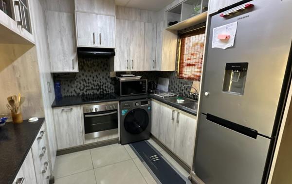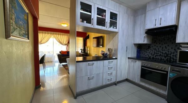 This home boasts two generously sized bedrooms, each featuring sleek porcelain tiled floors and built-in cupboards, creating a sophisticated yet functional living space. The full bathroom is impeccably finished, complete with a bath, shower, toilet, and basin, offering a serene space for relaxation. The open-plan kitchen is a standout feature, showcasing ultra-modern finishes, perfect for culinary enthusiasts and entertaining. The kitchen flows effortlessly into the lounge and dining area, both enhanced by glossy porcelain tiles for a polished look and seamless living experience.
