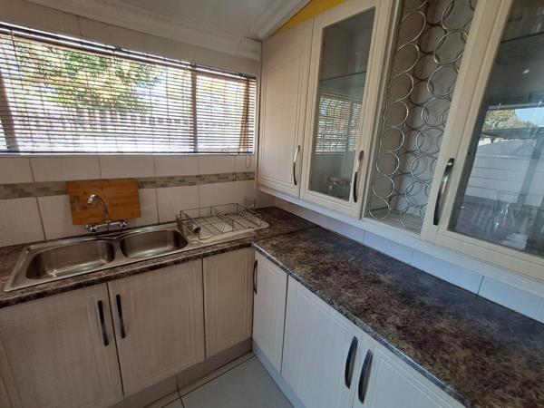 Externally, the property sits on a generous 800 sqm erf, offering a private garden and a refreshing swimming pool, perfect for relaxation and outdoor activities. A significant highlight is the extensive paved yard space, providing parking for up to 8 vehicles, including a covered carport. The property is totally walled and features an access gate, enhancing security. Additional security measures include window bars and a security gate, visible on the well-maintained exterior. This home is also wheelchair friendly and allows pets.