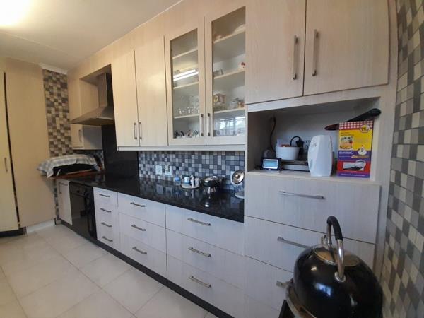 Outdoor living is a highlight, with a refreshing swimming pool and a thatched lapa, complete with a built-in braai and bar, ideal for entertaining. The established garden and paved areas offer low-maintenance enjoyment. Security is paramount, featuring electric fencing, burglar bars, an access gate, and 24-hour security, ensuring peace of mind. The property is also fibre-ready and pet-friendly.