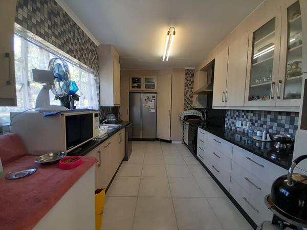 This inviting 3-bedroom, 2-bathroom family home in Mulbarton, Johannesburg, offers comfortable suburban living with excellent amenities. The property boasts a modern grey exterior, a red tiled roof, and a welcoming brick-paved driveway leading to a double garage and ample additional parking for up to six vehicles. The totally walled perimeter enhances privacy and security.