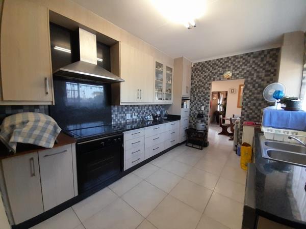 Inside, the residence features a spacious lounge, a dedicated dining room, and a family/TV room, all benefiting from tiled flooring and abundant natural light. The open-plan design enhances flow, while a decorative wooden ceiling beam adds character. The well-appointed kitchen is equipped with light-toned cabinetry, dark granite-style countertops, a double sink, and modern appliances including a built-in oven and range hood, perfect for culinary enthusiasts. An extra room with a built-in-bar provides a dedicated entertainment space.