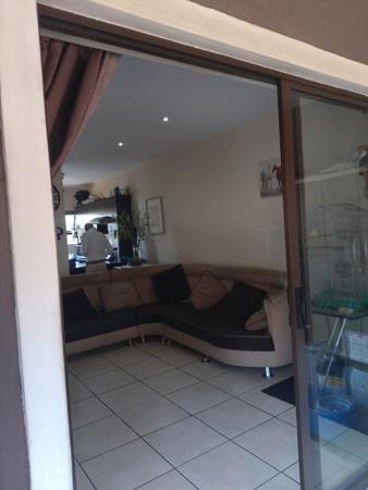 The spacious lounge area is finished with durable tiled flooring and modern recessed lighting, creating a welcoming atmosphere. A large L-shaped sectional sofa offers ample seating, and a sliding glass door provides seamless access to an outdoor utility space. The three bedrooms are generously sized, with the main bedroom benefiting from an ensuite bathroom, complementing the additional well-maintained bathroom. Tiled flooring extends throughout the living areas and bedrooms, ensuring easy maintenance.