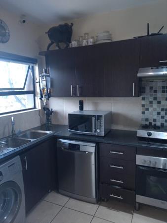 Discover comfortable living in this inviting 3-bedroom unit located within a secure complex in Mulbarton, Johannesburg. Designed for modern convenience, the interior boasts a well-appointed kitchen featuring contemporary dark cabinetry, sleek black countertops, and stainless steel appliances, including an integrated dishwasher and washing machine. A separate countertop gas stove adds to the functionality, while a window above the double sink provides natural light. The kitchen also includes a discreet CCTV camera for added peace of mind.