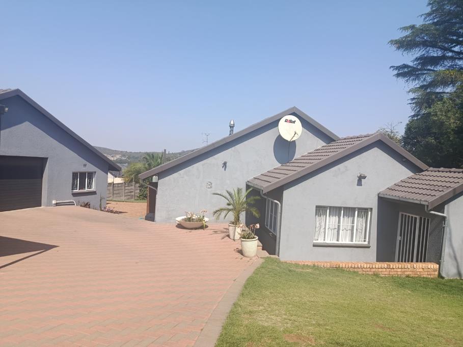 Discover this impressive family home nestled within a secure estate in Mulbarton, Johannesburg, a desirable metropolitan suburb. The property presents a modern grey exterior, dark tiled roof, and an extensive, neatly paved driveway with a herringbone pattern. A well-maintained garden and distant hill views contribute to its welcoming kerb appeal.