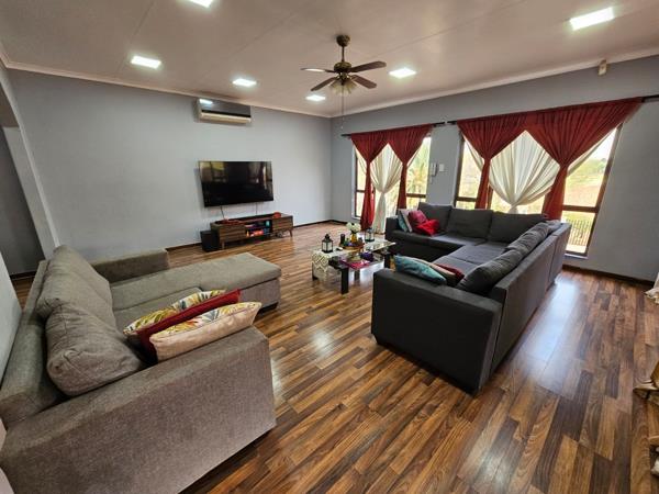 The stylish kitchen includes a separate laundry, while the open-plan lounge and dining room offer warm, welcoming spaces enhanced by laminated floors and beautiful attention to detail. A balcony with scenic hill views, plus a lapa and braai area, make entertaining and family time a pleasure.