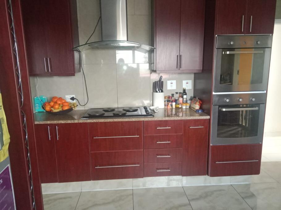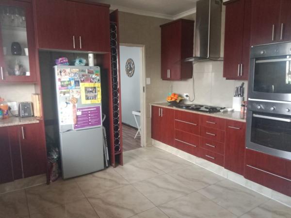 This inviting four bedroom, two bathroom residence, including one on-suite, is nestled in Mulbarton, Johannesburg. Designed for comfortable family living the home boasts an impressive open-plan layout connecting the living, dining and kitchen areas. The spacious lounge and dining room are bathed in natural light featuring modern wood-look laminate flooring and neutral walls complemented by an air conditioning unit and ceiling fan for comfort. An elegant arched entryway adds architectural interest.