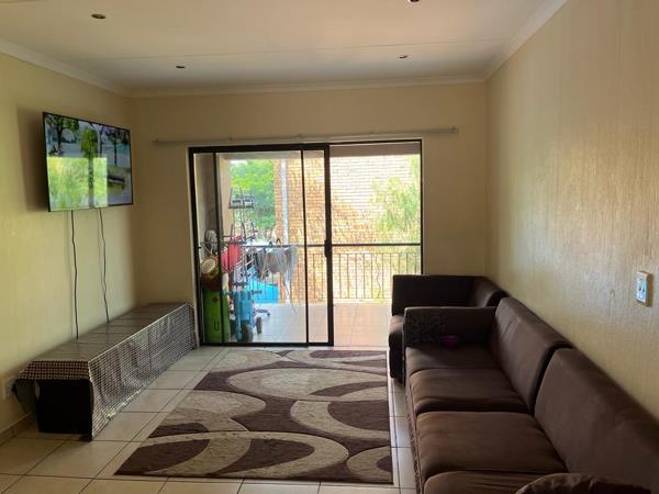 The apartment features three well-sized bedrooms. The main bedroom boasts an en-suite bathroom, while the second and third bedrooms share a full bathroom. The unit is fully tiled for easy maintenance.