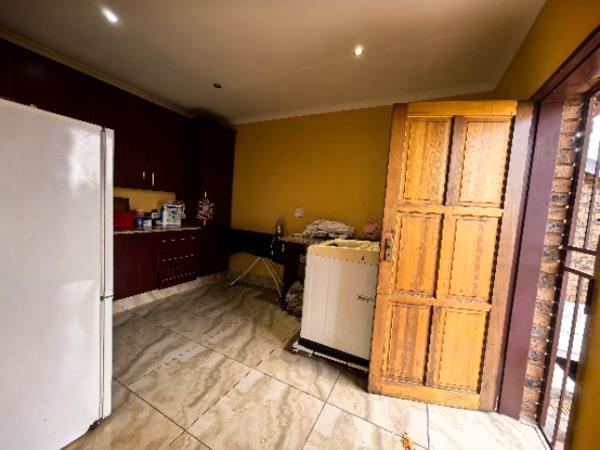 1385 square meters stand. Offers 4 bedrooms with build in cupboards, 2 bathrooms with main ensuite, modern kitchen with separate laundry, open plan lounge and dining room with laminated floors, potential flatlet with own entrance, double garages with extra parking that can park 5 cars, balcony with scenic views, lapa and braai area, Wendy house that can be used as staff quarters or or storage room, for security you get CCTV, alarm, alarm system, beams and burglar bars.