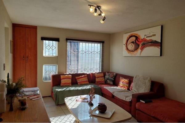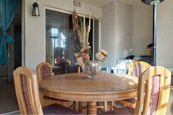 Featuring two bedrooms with wood laminate flooring and built-in cupboards, plus an enclosed room ideal as a third bedroom or study. The modern kitchen offers ample storage, and the full bathroom includes a shower and bath. Living areas are tiled. A private garden with a built-in braai is accessible from the enclosed room. The complex provides 24-hour security, a covered parking bay, abundant visitors parking, and a communal swimming pool. Convenient access to public transport and major transportation routes