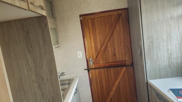 Inside, the functional kitchen is equipped with modern light wood-grain cabinetry, a white countertop, and a built-in hob, benefiting from natural light through a window fitted with security bars. This compact and efficient space is ready for daily use, offering practical storage solutions. The home comprises two comfortable bedrooms and a well-appointed bathroom, providing essential living spaces.