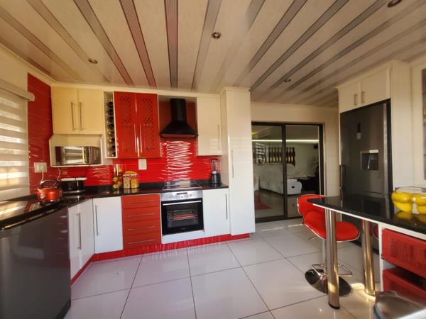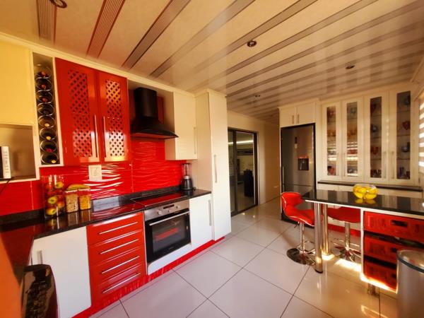 Step inside to a thoughtfully designed interior, where the modern kitchen stands out with its vibrant red and white cabinetry, black granite countertops, and tiled flooring. Equipped with a built-in oven, hob, extractor fan, and a large refrigerator, it also includes a practical breakfast bar with seating and a wine rack. The kitchen seamlessly connects to the living areas via sliding glass doors, creating an open and engaging flow perfect for entertaining. The home further benefits from a comfortable lounge and a dedicated family TV room, offering versatile spaces for relaxation.