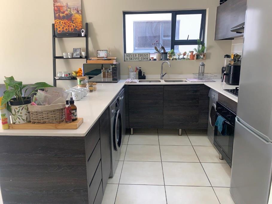 Step into a **sun-soaked open-plan lounge and dining area**, perfect for relaxing or entertaining. Large sliding doors open onto a **spacious private balcony** overlooking the peaceful hills and greenery of Johannesburg South.