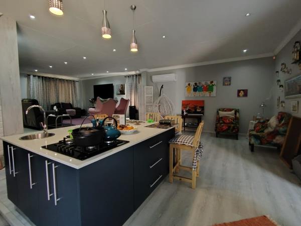 Discover this spacious 4-bedroom, 2.5-bathroom family home situated in the desirable suburban area of Oakdene, Johannesburg. The interior boasts a well-appointed kitchen featuring sleek dark cabinetry, white countertops, and a stylish subway tile backsplash, complemented by herringbone-patterned floor tiles. A modern kitchen island with an integrated hob and sink serves as a focal point, seamlessly connecting to the lounge and dining areas, creating an inviting atmosphere for daily living and entertaining. The property also includes a built-in bar, perfect for social gatherings.