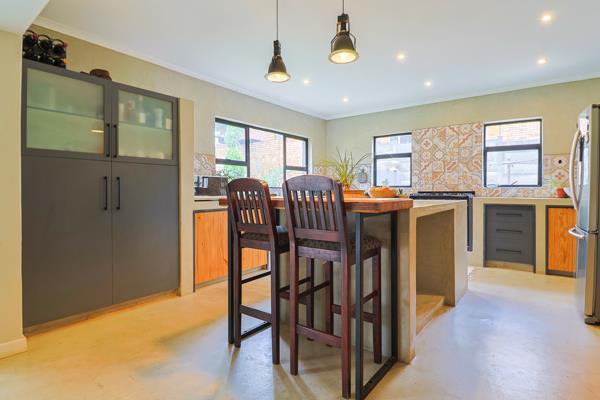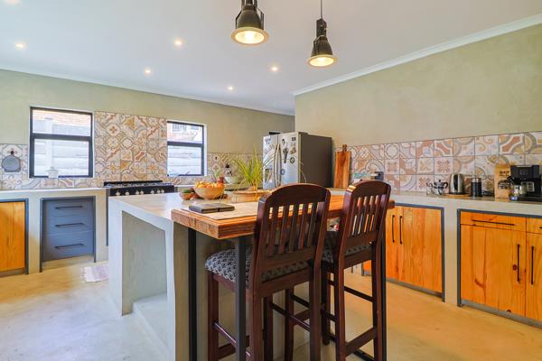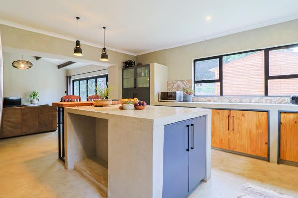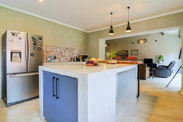 The open-plan kitchen is a chefs dream, featuring ample workspace, a large monolithic island, pantry, and fitted appliances including a gas stove, washing machine, and dishwasher connections. The ultra-modern kitchen flows effortlessly into the spacious family lounge and dining area, creating a welcoming environment for daily living and entertaining.