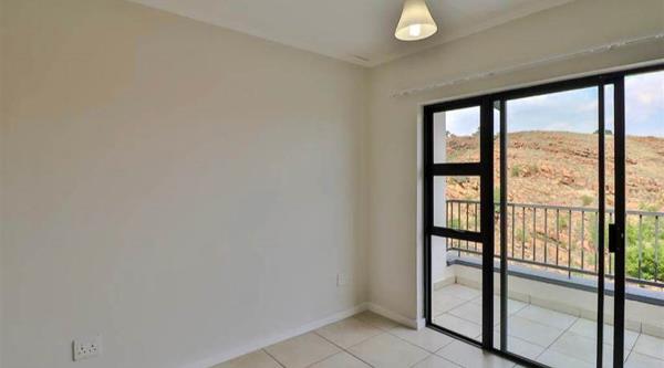1 spacious bedroom fitted with built-in cupboards, tiled flooring and a sliding door leading on to a balcony with a beautiful view.