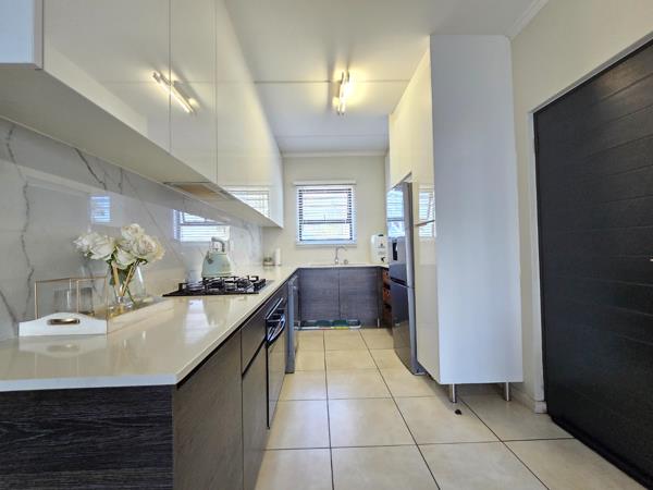 Step into a sleek, modern kitchen featuring elegant quartz countertops, high gloss cabinetry, and dedicated space for your dishwasher, washing machine, and fridge. A 4-plate gas stove completes the culinary setup, ideal for the home chef. The open-plan layout allows the kitchen to flow seamlessly into the dining area and spacious lounge, creating a warm and inviting atmosphere for both relaxing and entertaining.