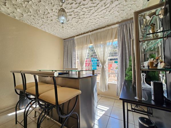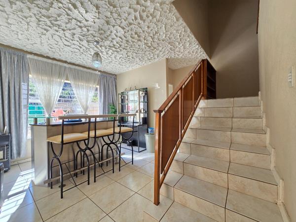 Step outside into a charming courtyard area, perfect for outdoor braais, drying laundry, or simply a safe space for kids to play. Just off the dining area is a guest bathroom fitted with a toilet and basin, along with a handy storage space under the staircase.