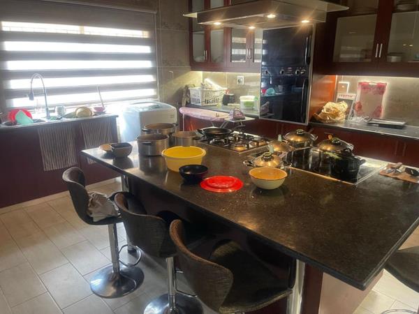 The heart of this home is its expansive, modern kitchen. Equipped with dark wood cabinetry, sleek dark granite countertops, and a large central island with seating, it''s a chef''s delight. Integrated stainless steel appliances, including a built-in oven, large refrigerator, integrated gas cooktop, microwave, and range hood, cater to all culinary needs. Under-cabinet lighting enhances functionality and ambiance. The residence offers four comfortable bedrooms and two well-appointed bathrooms, providing ample accommodation for a family.