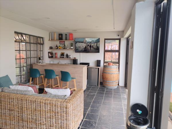 For those who love to entertain, the dedicated entertainment area features a built-in braai and a stylish bar setup, ready to host your next celebration. Additional conveniences include two outside storerooms that can easily be converted for various uses, as well as an external toilet for guests or domestic staff.
